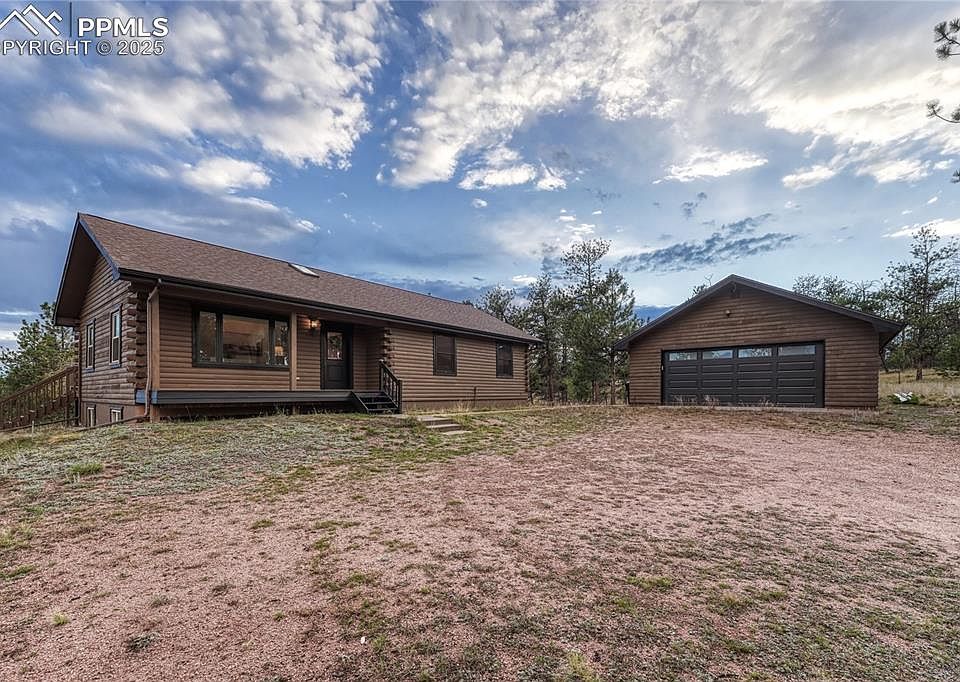 Looking for a log home with great bones? This 2-acre property offers amazing views of rock formations and mountains including Pikes Peak and Mt Pisgah! No need to worry about wildfire mitigation with this property, it has already been done. No need to worry about running out of propane since this property is connected to natural gas! Very usable lot if you decide to add a workshop or another outbuilding. The front porch leads you into a spacious main level living room that is bright with a ceiling fan, skylight, coat closet, and vaulted ceilings. The kitchen features a skylight, brand new included stainless steel appliances, casement window over the kitchen sink, cabinet pantry, and a wood plank ceiling. The dining area is adjacent to the kitchen with an updated light fixture and provides a walk-out to the back deck. There are three bedrooms and two bathrooms on the main level. The primary bedroom provides a ceiling fan, double closets, and an adjoining 3/4 bath. There is a full main level hall bath with a skylight and linen closet in the hallway. The unfinished walk-out basement with a door at bottom of stairs offers plenty of space for storage or expansion. The new washer and dryer have never been used and are included! Utility sink * Newer boiler * The detached oversized 2-car garage has a new overhead door, new service door (with path leading to home), new windows, and a new overhead opener with key pad * Additional features of this home include New Pella doors and windows with built-in cellular blinds, a 10x12 storage shed w/a metal roof, radon mitigation system, Wiring is in place for StarLink and is included, all you have to do is add the dish, wood plank ceilings, VELUX skylights with built-in shades, railroad tie retaining walls have been replaced with block retaining walls, newly painted front deck, newly stained back deck, and newly stained logs * 30-min to Cripple Creek, 24-min to Woodland Park, and 8-min to Florissant Fossil Beds National Monument