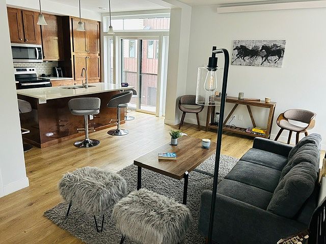 Modern and mountain livingGranite countertopsWood burning fireplaceOpen floor planStorage spacesBeautiful wood accents