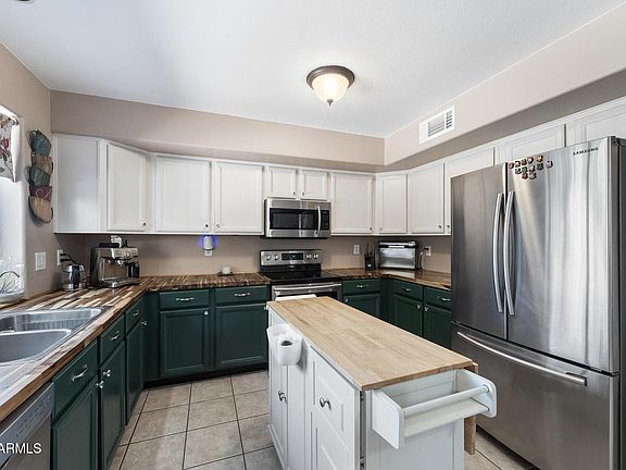 Downstairs greets you with sleek tile flooring, a custom built-in entertainment center, and a kitchen that's sure to impress — featuring two-toned cabinets, stainless steel appliances, butcher block countertops, and a reverse osmosis system. The French pantry doors are the perfect finishing touch for this culinary haven. Upstairs, enjoy the warmth of premium laminate flooring, blown-in insulation for energy efficiency, and new ceiling fans throughout. The laundry room offers extra storage with upper cabinets, making chores easier! Step outside to your private retreat or shall we say retreats? With three separate yards secured by locking iron gates, you'll find endless options to relax or entertain. Enjoy a 700 sq ft flagstone patio, a high-end Firemagic BBQ setup with sink and bar, sun shades, and a blend of grass, turf, and desert landscaping for year-round beauty and easy maintenance.