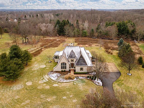 Every now and again an absolute jewel comes along. This one is hidden ON the beaten path. Just off Dexter-Ann Arbor Rd, the main thoroughfare between Dexter and Ann Arbor is a private drive with 5 homes on estate sized lots. This magnificent home sits at the end of that drive on 4.33 acres. A beautiful stone with brick accent facade invites you into this rustic elegant home. Traditional and eclectic accents throughout make it truly one of a kind, starting at the gracious foyer with natural-edge travertine tile and gleaming wide plank flooring that flows through the dining room and great room area. A room at the entry, separated by french doors can be used as a private sitting room or home office. Beyond that is a formal dining room large enough to accommodate a table that seats at least 10 10 guests. Custom kitchen cabinetry, a Subzero refrigerator and Dacor range/oven continue the high-end materials and details throughout. A fantastic sunroom catches the eastern morning sun, all the way to the western sunset glow. This floor is completed by the ensuite and mudroom/laundry entry from the garage. Each bedroom upstairs has its own private bathroom and the basement has a wall of daylight windows plus plumbed for a bath and wet bar., Primary Bath