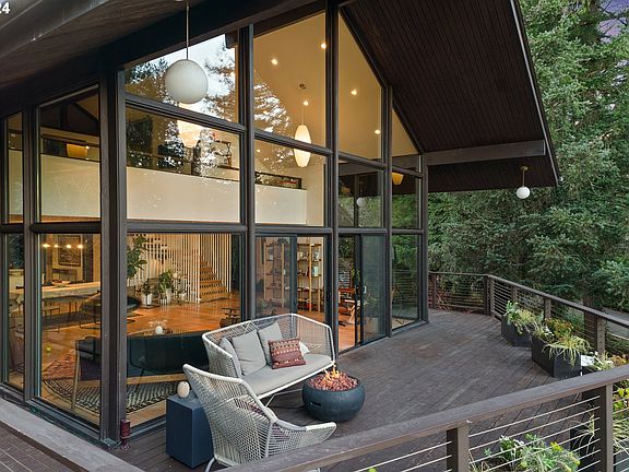 This breathtaking Dunthorpe midcentury A-frame home is a true masterpiece of interior design, offering an idyllic backyard oasis and stunning views of majestic Mount Hood. The moment you step inside, the wall of east-facing windows will immediately capture your attention, flooding the main-floor great room with abundant natural light. The great room's open-plan living space flows seamlessly into the dining area and the gourmet kitchen, which boasts an expansive center island, top-of-the-line stainless steel appliances, and exquisite designer lighting. Continue upstairs, and you'll find the primary suite, an awe-inspiring space with mountain views, an office nook, and walk-in closets. The en-suite master bath is equally impressive, with a luxurious walk-in shower, a soaking tub, two sinks, and separate dressing areas. Just off the kitchen on the main floor, you'll find a second bedroom with a loft and flex space, a versatile suite that can serve as a home office, guest space, or both. Floating stairs lead down to the home's bottom floor, where you'll discover a family media room and wet bar, perfect for movie nights and entertaining guests. Two generously sized bedrooms are located down the hall, with a shared full bath. An additional bonus space was converted into a designated workout room. The stunning gardens were designed by top Portland landscape design firm Pistils, featuring a Japanese soaking tub and architectural underlit concrete steps leading to an entertaining patio with access to the lower floor wet bar. Expansive decks flow from the home's first floor, providing the perfect setting for outdoor entertaining or simply relaxing and taking in the breathtaking mountain views. The gravel driveway provides ample parking space for your camper, boat, or small RV, making this home the perfect retreat for those who value privacy, luxury, and style.