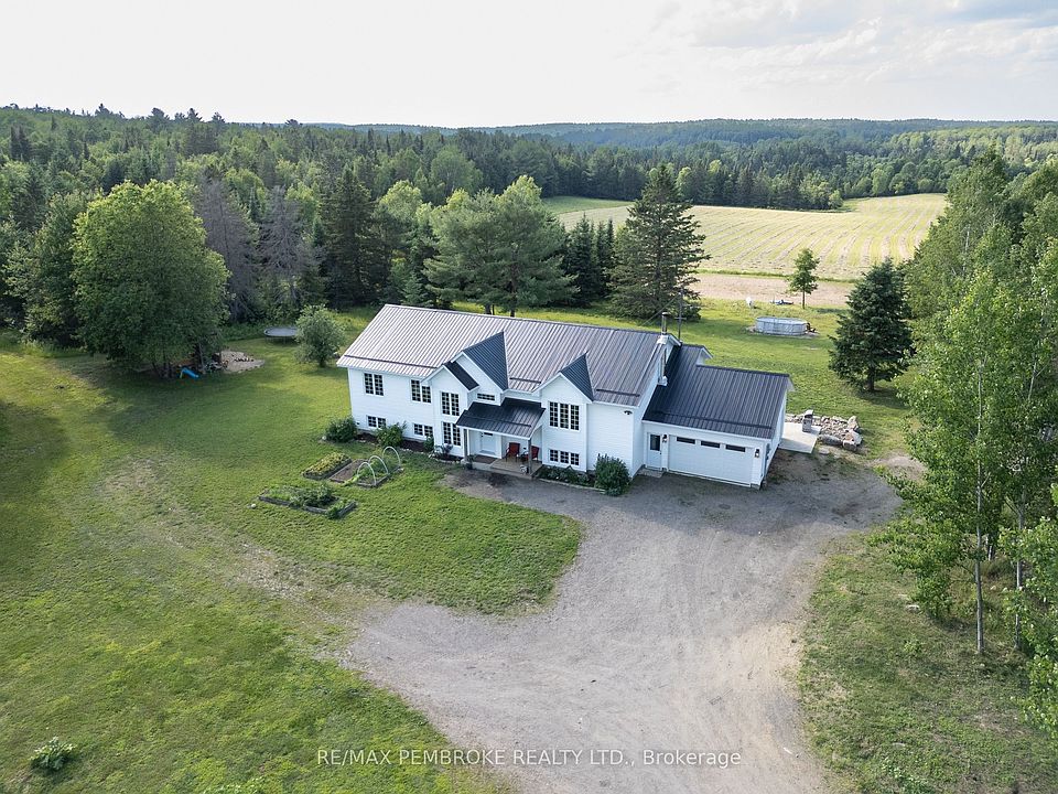 This custom built home sits on a picturesque, three acre parcel of land surrounded by fields, on a quiet country road; a quick 15 minute drive to Petawawa or Pembroke, and short commute to Highway 17. The raised ranch design welcomes you with a spacious foyer and ample natural light. The upper level boasts a custom kitchen by Sylvestre's, with modern cream cabinetry and contrasting island that seats six, has a built in second oven, and offers an abundance of prep space with natural granite countertops, and an apron front sink overlooking the rear yard. You have access to the deck and yard, as well as the attached garage from the main floor. Also on this level you will find a spacious primary bedroom with cheater ensuite and walk in closet, and two additional bedrooms. The lower level offers an expansive family room with wood fireplace, two more bedrooms, full bathroom, large finished laundry room and a utility room with lots of space for hobbies. 48 hour irrevocable on any Offer