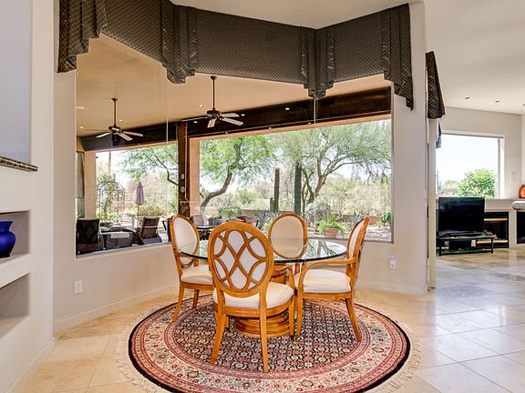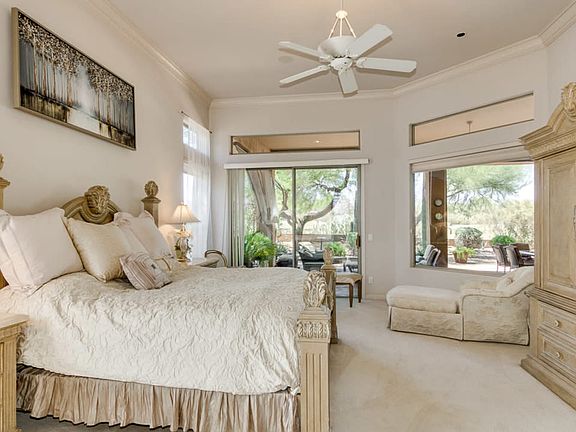 Stunning property located on the 17th green, Peaks Golf Course, in Tonto Verde of luxury living. upgraded stone driveway, featuring 3 full car garage w/custom storage cabinets 12 ft ceilings with crown molding entryway, living room & bedroom. Dining room features a butler pantry, custom built in buffet. Massive stone fireplace in living room for cozy evenings. Very light and bright open floor plan with large tinted windows. Kitchen features granite countertop, 22 ft breakfast bar.
