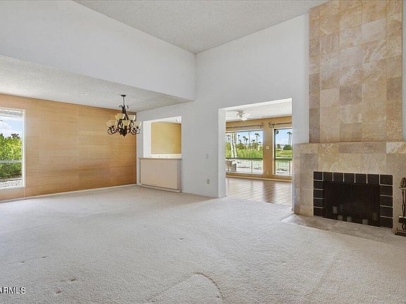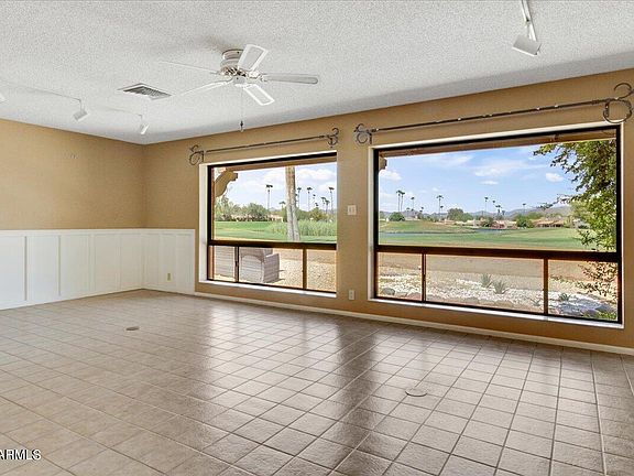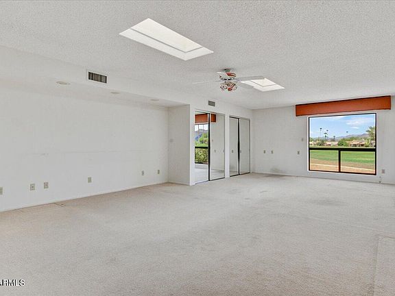 & mountain views this is a true lock and leave home, with security shutters on all windows. Enjoy the pool across the street just for this small community of homes. This is a very spacious home, 2103 sq. ft. All rooms are generous in size, great room with fireplace, dining area, large family room across the back with views of golf and mountains. Primary bedroom with en-suite, guest room has access to another nearby bathroom. Bonus room off the kitchen is quite large & ready for remodel (Approx. 330 Sq, Ft.+/- not included in liveable sq. ft.) A large 2 car garage plus golf cart garage. !