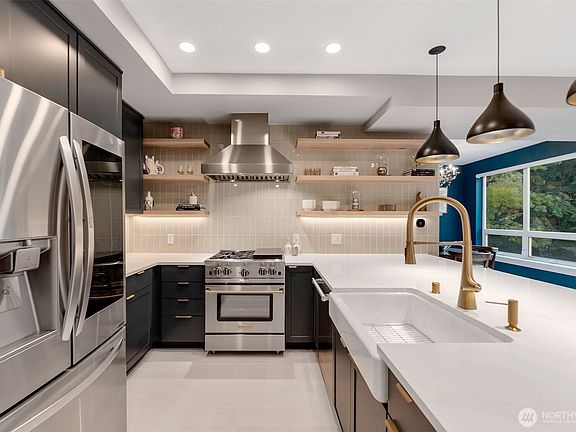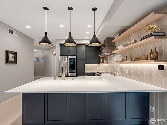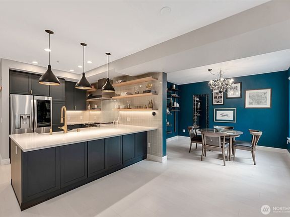 Stunning remodeled 2 bed/2 ba condo in the desirable Monohon complex. Over $110K in recent updates. Soaring 9' ceilings & white-washed engineered hardwoods enhance the open-concept design. Stunning chef's kitchen w/ custom cabinetry, quartz counters, elegant backsplash, floating shelves w/ lighting, & high-end appliances including a gas Bluestar range & Zephyr hood. Recessed lighting, & updated designer fixtures. Newer heat pump, water heater, washer & dryer. Enjoy a cozy gas fireplace, private deck, & details like a Murphy bed/desk combo in the 2nd bed. One underground parking space & storage unit. HOA dues cover water, sewer, garbage, gas & more! Unbeatable Issaquah location—minutes to I-90, parks, Lake Sammamish, and downtown amenities.