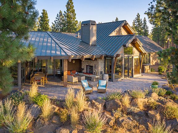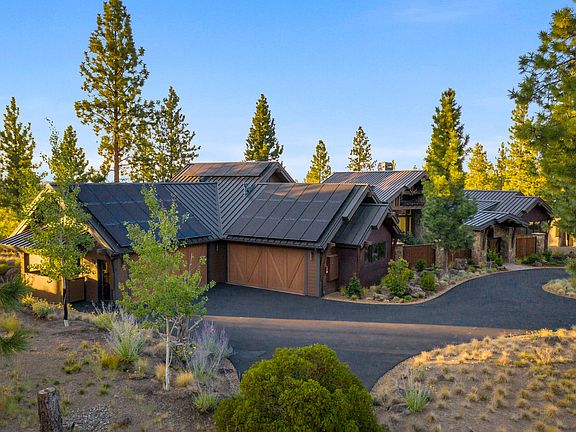 An inspiring and completely private setting located in the coveted Tree Farm community on Bend's Westside! Sited on a premier 2 acre lot, this classic Northwest masterpiece by Norman Building offers an exceptional, SINGLE LEVEL floorplan w/stunning Cascade and Shevlin Park views. Natural design elements include dramatic timber beams, stone, warm wood and steel accents throughout. Exquisite Great Room features wood burning fp, soaring ceilings and windows framing the Cascades and tree-lined vista. Chef's kitchen w/concrete counters, extensive island and Thermador appl. Family Room w/gas fp. Primary Suite features fabulous window seat looking out to the views and spa-like BA w/quartz vanity, soaking tub and tiled shower. Private home office. Multiple outdoor spaces to enjoy: Entertain al fresco on the covered patio w/outdoor fp, relax by the firepit, or begin the day in the delightful front courtyard w/tranquil water feature. 4 car garage. Moments to Westside amenities and schools.