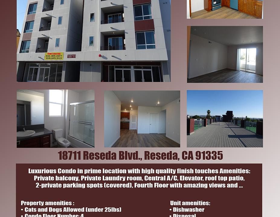 Available Oct. 1st, 2017 $2,150 3 bedrooms 2 baths Description Brand New Luxurious Apartment in prime location with high quality finish touches Amenities: Private balcony, Private Laundry room, Central A/C, Elevator, roof top patio, 2-private parking spots (covered), Fourth Floor with amazing views and ... Cats and Dogs Allowed (under 25lbs) Condo Floor Number: 4 Cooling System: Central Elevator Floor Covering: Hardwood Floor Covering: Tile Laundry: In Unit Garage Parking Spaces: 2 Dishwasher Disposal Range/Oven Pricing comparison This 3 bedroom home is listed at $2,150, while 3 bedroom homes... in Reseda go for $2,645 in Los Angeles go for $3,204. in Los Angeles County go for $3,032. in 91335 go for $2,645. This listing is cheaper than the average 3 bedroom home in Reseda by $495. Nearby schools This rental at 18711 Sherman Way is within the boundaries of Los Angeles Unified School District. Reseda Elementary School Public Grades K - 5 0.2 miles Minimum Credit Score 700