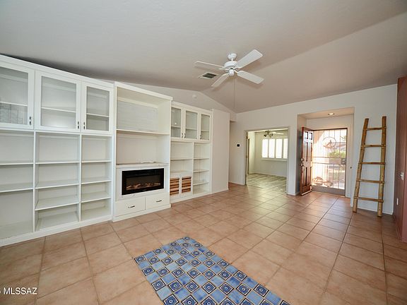 Enjoy endless views and thoughtful design in this well-appointed 2-bedroom, 2-bath, 1,088 sq ft home, perfectly positioned on a quiet, elevated lot. Serene vistas stretch across the Tucson Mountains, Santa Ritas, and the 18th fairway of San Ignacio Golf Course. Inside, vaulted ceilings and a custom built-in fireplace wall create a warm, open atmosphere. The kitchen is both functional and inviting, offering generous counter space, ample cabinetry, and a convenient pantry. Ceramic tile and plank-style flooring, plantation shutters, new windows, and a sliding glass door welcome natural light throughout. Step outside to a peaceful patio designed for outdoor enjoyment, while an expanded garage with built-in storage adds extra convenience to this efficient and comfortable retreat
