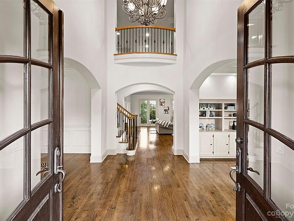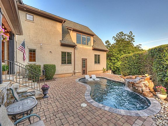 This distinctive French-Tudor style estate showcases a harmonious blend of classic elegance and modern comfort. The graceful exterior, characterized by steep roofs, tall windows, and delicate wrought iron details, creates a timeless appeal. Superior craftsmanship throughout the interior boasts deep crown molding, exquisite millwork, and the finest hardwood floors perfectly compliment the curved arches and decorative ceilings that provide an air of sophistication and old-world charm. The gourmet kitchen features top-of-the-line appliances, two functional islands, a butler's pantry, and a 150-bottle capacity wine cooler. The primary bedroom suite on the main level offers a serene retreat with access to the covered porch and views of the stunning outdoor oasis. The second and third levels house four additional en suite bedrooms, a huge bonus room with entertainment bar, and a custom theater. Outside, the heated saltwater pool and hot tub ensure year-round relaxation and enjoyment.