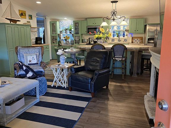 Welcome home to an inviting open-concept layout where a navy-and-white color palette and seafoam green cabinetry set a crisp nautical tone. The vaulted ceilings enhance the sense of space, while the mantle-encased electric fireplace adds warmth and charm. The kitchen is a showstopper — featuring a huge island, stainless steel appliances, and walls of cabinetry that make both cooking and entertaining effortless.