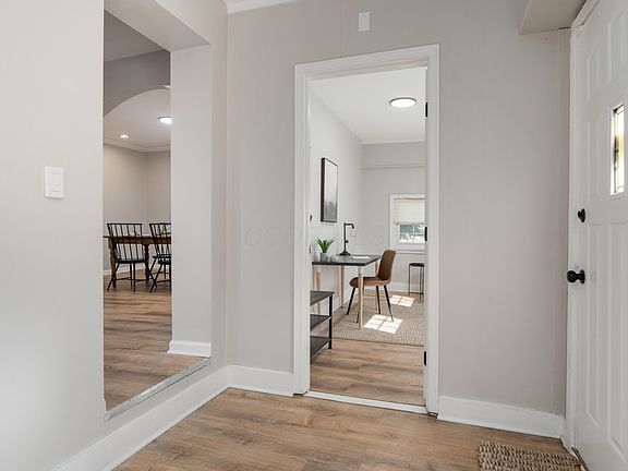 Welcome to this 3-bedroom, 2 full bath recently renovated home, nestled in a quiet, established neighborhood. Step inside to discover warm wood flooring throughout and a bright, welcoming interior filled with natural light. The kitchen features white cabinetry, stainless steel appliances and a sleek tile backsplash. Just off the primary bedroom, you'll find a cozy sitting area—perfect as a reading nook, private office, or nursery. Relax and read a book in the soaking tub in the primary full bath. In addition to the three bedrooms, this home offers three versatile flex rooms, providing endless options for a home office, gym, playroom, or creative studio—tailor each space to fit your lifestyle. The full basement offers generous storage or potential for future finished living space. Recent updates include a newer roof, windows, AC, sump pump, water line, upgraded electrical system, and a fully restored furnace (2020) for year-round comfort. Outside, enjoy the serenity of a spacious back porch overlooking the extra-large fenced backyard—perfect for entertaining, gardening, or simply relaxing on warm summer nights or crisp autumn mornings. Located near major freeways and downtown Columbus.