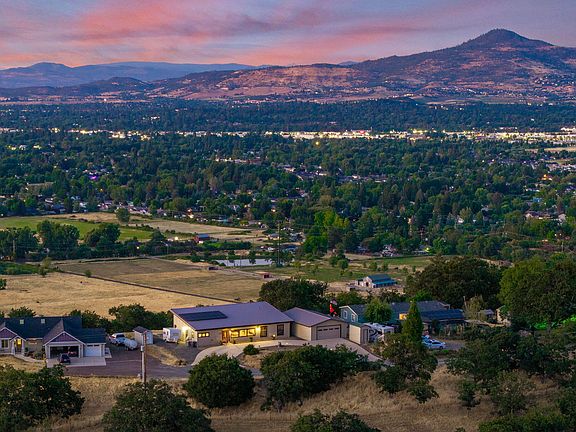 This custom-built, modern style home with true 180-degree views feels like a true piece of artwork. From the stunning curb appeal to the solar panels, you're sure to appreciate all the attention to detail. Amazing natural light throughout the versatile and open floorplan. Concrete flooring throughout and a spacious chef's kitchen with five-burner cook top, large center island, granite counters and a butcher block prep table. Formal and informal living areas with a large great room and vaulted ceilings. The oversized windows allow an abundance of natural light and all the surrounding mountain and city views. A glass sliding door off the dining area provides easy access to the outdoors. Large primary suite with custom dual sink vanity and large tile shower. Located in a country setting but close-in to city amenities. RV parking plus a detached 936 square feet garage. This is truly one-of-a-kind.