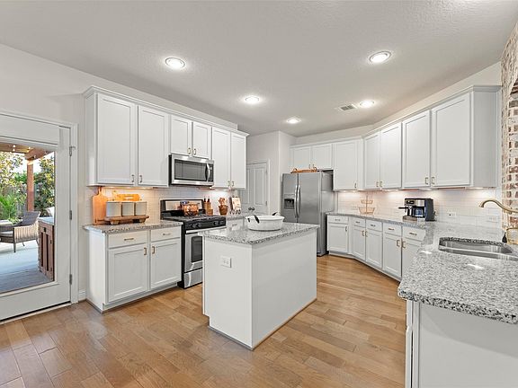 Brick gas fireplaceOutdoor kitchenNew light fixtureBuilt-in grillStainless steel appliancesGranite countersInviting open floorplan