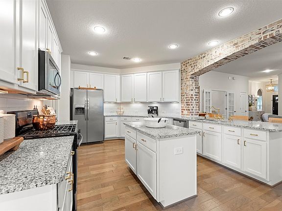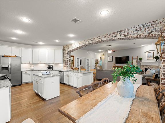 STUNNING one story home with modern comforts & timeless appeal! Step inside this designer home to discover an inviting open floorplan filled with natural light, featuring a spacious living area with brick gas fireplace, shiplap accent wall & beautiful arched brick wall! The charming front bedroom has a shiplap accent wall, chandelier & bench seat. The second bedroom has crown molding, chair rail & new light fixture. The gorgeous island kitchen boast granite counters, stainless steel appliances, undermount sink, under counter lighting, brass hardware & brass faucet. Large office/playroom with French doors. The master bedroom has bay window and his/her closets plus his/her sinks with marble countertops in the bathroom. The backyard oasis has so much to offer including an outdoor kitchen fully equipped with built-in grill, fridge & ample counter space-ideal for hosting family gatherings. The Pergola offers room for dining & lounging with lighting & fan to keep you comfortable year round!