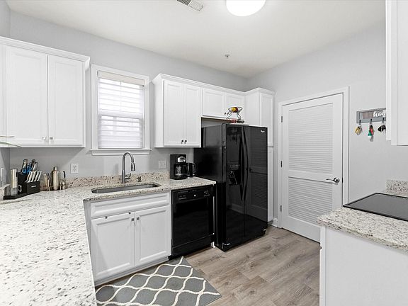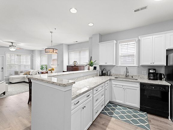 Don't miss this Stunning home! First floor, corner unit, with water views in desirable Admirals Quarters community. Just minutes from Birkdale! Loaded with upgrades (Updated since 2019: HVAC/Furnace, kitchen and bathroom cabinets with soft close, granite countertops throughout, repainted, LVP flooring, lightning, electronic blinds, tinted windows, keypad entry). This open floor plan features granite counter tops, walk in pantry/laundry room, a large primary en suite, gas fireplace, and sunrise views over the water! Relax in the spacious living area or enjoy entertaining on the back porch. The primary bedroom features new barn door entry, two walk in closets, dual vanity, walk in shower, and water views. Secondary bedroom is perfect for guests or at home office, featuring a full bath with shower/tub combo. Community features: Pool, tennis/pickleball court, clubhouse, playground, walking path around pond, boat docks, and much more!