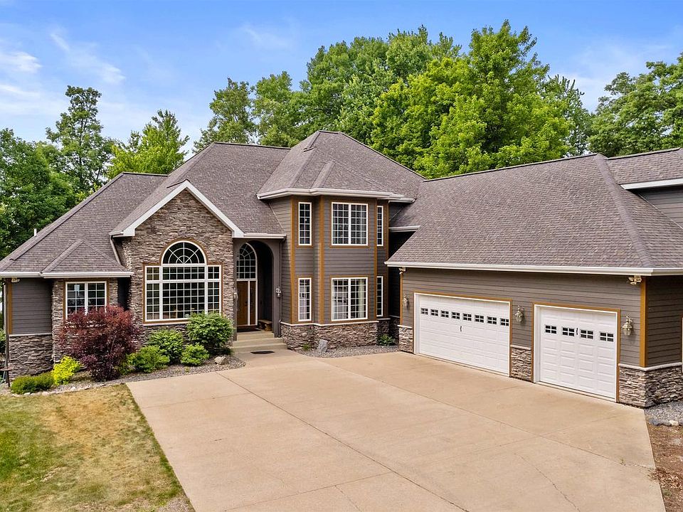 Welcome to the Lake, within minutes of Sand Valley Golf! Custom built lake estate features 207 ft of frontage, 6686 sq ft, sitting on 2 waterfront lots totaling 1.62 Acres! This 5 bedroom, 5 bath home is a must see! High end Features Include: Custom built Amish cabinets, double patio doors for amazing views of the lake, granite counter-tops, porcelain tile, new laminate in the main level and owners suite, 4 ensuite baths, a finished LL with workout area, bonus room, game room, sauna, custom bar and second fireplace. Attached 3+ car heated garage and a detached 4+ car garage for all your toys. New roof & gutters, refrigerator, dishwasher fall '23, maintenance free deck, patio w/ fire pit, playground set, shed, large area for a future swimming pool. Currently in the Vacasa rental program.