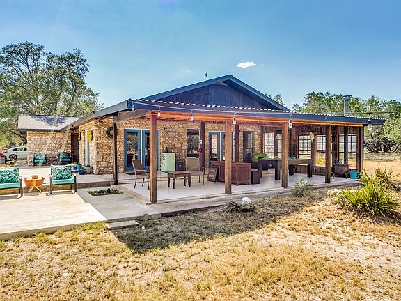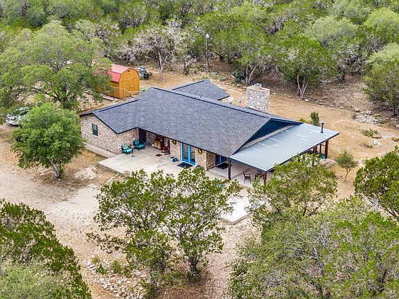Llano RIVERFRONT property. Wide river rock beach. You can walk straight into the cool, clean blue water. Loads of extras including a pavilion with electricity, outdoor BBQ & smoker, deer feeder, tree house, root cellar, shed, benches, bountiful nature and Big Night Sky. Home has been lovingly built with hand picked River Rocks. The slab has been extended beyond the perimeter for an addition. Large covered porch. There is a wood burning stove, new appliances and updated kitchen w/ quartz countertops and new flooring. There is a 12 acre private HOA park at the waterfalls. Appliances convey.