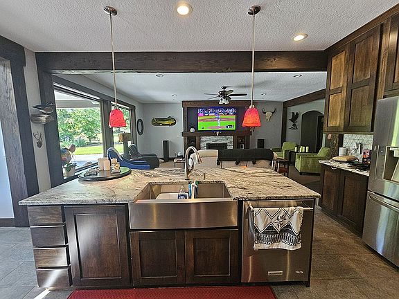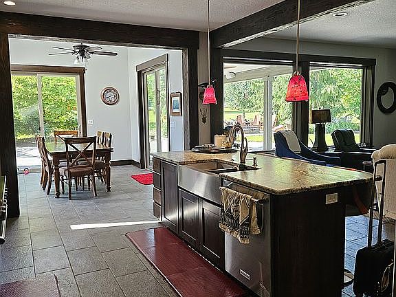 Hot tubIn ground sprinklersPaved patioSliding glass doorBeautiful landscapeStatement wood beam accentsSlate floors