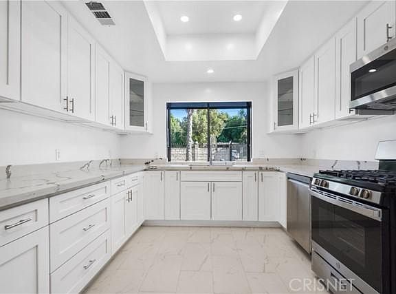 Amazing Two Story remodeled Pool home with Natural lights and 5 Bedroom and 4 Bathrooms. 2 Living room with Gas/Wood burning fireplaces. Vaulted ceiling and some skylights. Perfect home for a family to be close to Ventura Blvd and parks, shopping and places of Worship. Remodeled Kitchen with bay window, quartz counter-tops, self closing cabinets with all new stainless steel appliances, all Bathrooms are remodeled. 4 Good size bedroom downstairs with 3 bathroom. easy access to the yard. The primary bedroom is upstairs with a private balcony and a large walk-in closet and amazing remodeled bathroom with tub and walk-in shower. A Large laundry room downstairs.2 New HVAC with dual zoning, NEW Thankless water heater, Copper plumbing. A motorized front gate. ready to Move in.