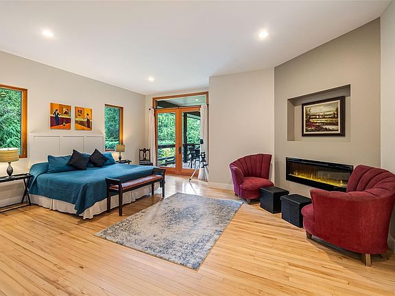 Contemporary exec homeLower-level suiteAttached guest cottageFirepit areaSpacious roomsUnique architectural anglesLarge deck