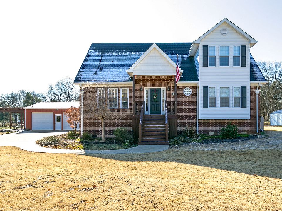 STUNNING brick home seated on 2 acres just outside of town & convenient to I-65! Home features 3BR/beautiful kitchen w/granite & lots of cabinet space, office/den, loft area upstairs over looking the LR, master bed downstairs, detach 2 car garage/shop with kitchen area that's a must see! This is a great place to entertain!!!