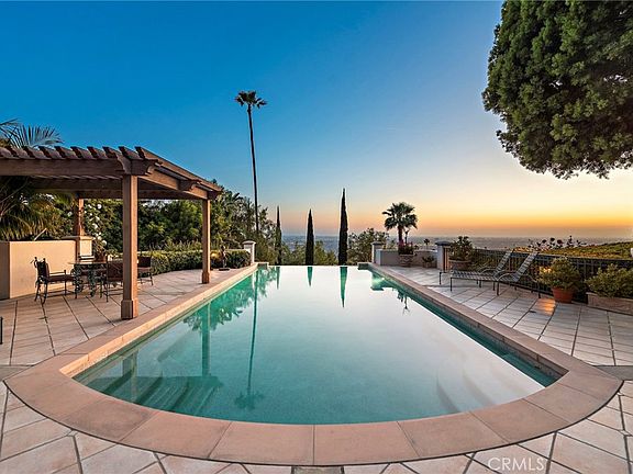 This estate is a compound unto itself, encompassing a guest house, carriage house, multiple garages, a recreation center, and an outdoor veranda exceeding 1,000 square feet, perfectly suited for grand entertaining or quiet sunsets. A circular motor court, central fountain, and garden pathways invite discovery. At the rear, an infinity-edge pool and spa command dramatic views by day and glittering city lights by night.