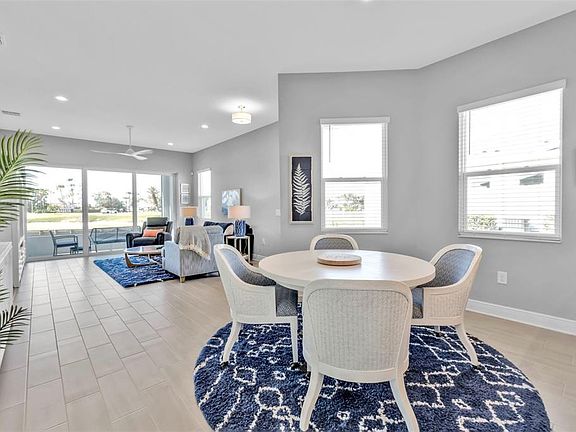 SUPER RARE SINGLE VILLA built in 2023 with an AMAZING VIEW of water and the 18th green available in the HIGHLY DESIRABLE golf course/active resort of KINGS GATE, a 55+ community that is NOT in a flood zone and in evacuation zone d (have never been under evacuation order). ENJOY the best of both worlds - with the nearly maintenance free living of the villas combined with the privacy of a single home. Lots of updated features throughout this home - quartz kitchen counters, porcelain tile throughout, impact windows, murphy bed/desk/wall, epoxy garage floor and more. Built in 2023 you still get to enjoy everything being like new (AC, Roof, appliances). Photos don't do this villa justice - come and experience the villa and that view first hand. The open concept floor plan is loved by many - with kitchen, dining room, living room and lanai all seamlessly connected. Off the dining room is the office/3rd bedroom with double doors and a murphy bed - allowing for maximum flexibility. Large master with walk in closet and walk in/roll in shower access also offering view of water/18th hole. Guest bedroom in the front of the villa offering both you and your guests much appreciated privacy. You're going to love having your morning cup of coffee or your favorite after dinner drink out on the lanai with a great view of water, 18th fairway and 18th hole. Tremendous location in the community - walking distance to clubhouse/pool/gym - pickleball courts and more. And if you haven't been to Kings Gate before - you're going to love the options for activity (Olympic size heated swimming pool and spa, tennis courts, pickle ball, lawn bowling, shuffle board, bocce, horseshoes, gym, billiards, library, euchre, bingo, bridge, Texas hold em, poker, mahjong and more). The onsite AND NEWLY REMODELED Lions Den restaurant and bar is super convenient and also offers Tuesday night Karaoke and monthly trivia contests. Many residents love the fact that they are just a golf cart ride away from the shopping plaza that provides you access to grocery store (ALDI), drug store, bank, restaurants and shopping. Want to explore outside of Kings Gate – you are minutes away from the restaurants and shops of downtown Punta Gorda and Fisherman's village. And if you want to explore more of Florida's fun spots you’re near I75 to quickly head north or south. A SUPER RARE SINGLE VILLA with a SPECTACULAR view in a PREMIER gated community won't last long. Call today for a private showing and a golf cart tour of the community/amenities.