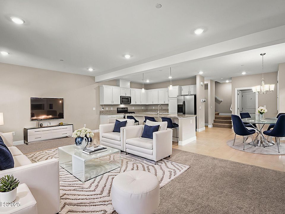 This stunning end-unit home in The Village at Esplanade offers a spacious floor plan filled with natural light. The open-concept living area features 9-foot ceilings, creating a bright and airy atmosphere. The modern kitchen includes upgraded appliances, granite countertops, and a large island with a breakfast bar. A stylish half bath on the main floor showcases an upgraded vanity and hardware. Upstairs, you'll find three bedrooms and two full baths. The expansive primary suite features a walk-in closet with custom shelving and organization, dual sinks, and walk-in shower. A convenient laundry area completes the second floor. Outside, you'll find a charming, private yard, complete with artificial turf and a Trex deck. Additional highlights include a tankless water heater, fully finished garage, 2" faux wood blinds, and neutral paint throughout. Residents of Esplanade enjoy a variety of community amenities, including a fully equipped fitness center with cardio and weight equipment, sitting area, dog zone, guest parking, and walking paths throughout the neighborhood. You'll also love being just steps from the Damonte Ranch Wetlands Loop and nearby Damonte Ranch Park. Built in 2019, this gorgeous home will provide low-maintenance and worry-free living for many years to come!