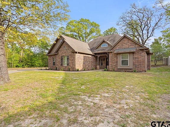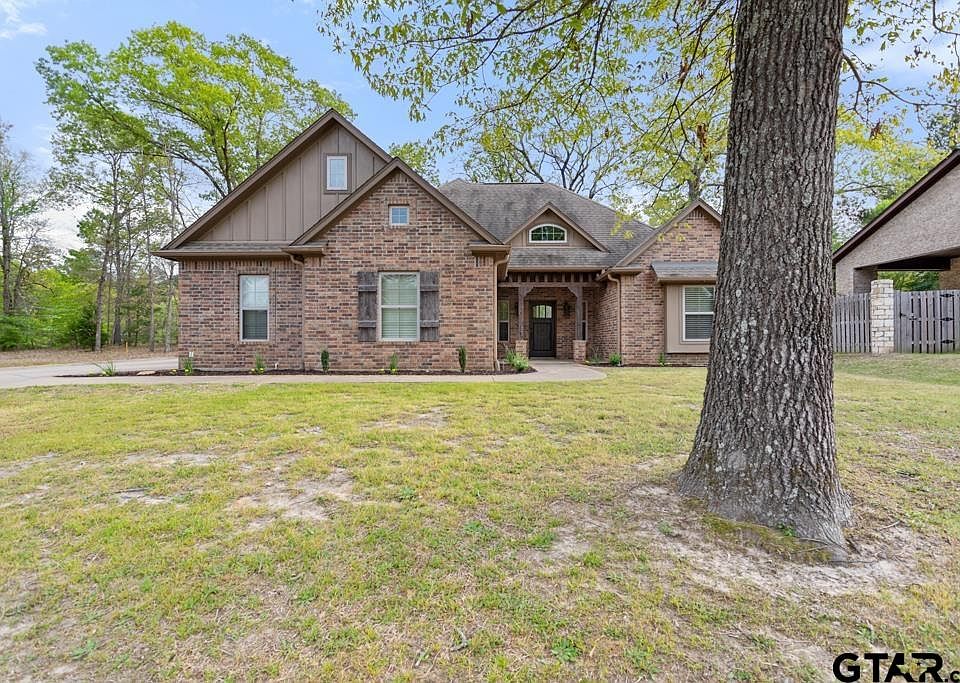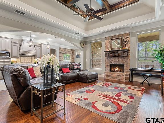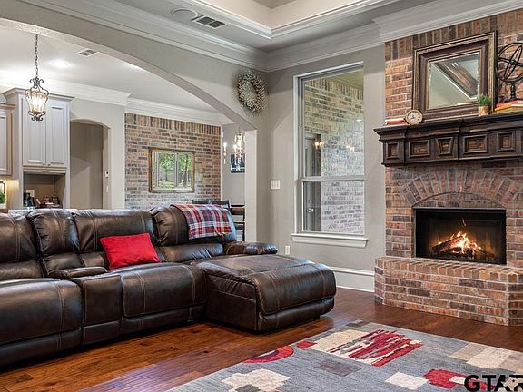 It's in the details! This gorgeous 2,117 square foot home in gated Stonegate West is just lovely. Sitting on the hill in a cul de sac, the curb appeal is welcoming and pretty. Fresh flower beds and plantings will greet you along the brick-lined sidewalk. Front porch would be fun to decorate for holidays and seasons. As you enter, you'll notice the open floorplan, double tray coffered ceiling, brick fireplace, wood floors, archways, and pretty crown and base moldings. The kitchen has gorgeous taupe custom cabinets (some with graceful glass trimmed fronts) with stained wood island, glass cook top, built-in stainless oven and microwave, ice maker, and stainless dishwasher. Granite counter tops, breakfast bar, pantry, and plenty of storage and counter space in this great kitchen. Breakfast room is big, with an awesome brick accent wall, and lots of windows overlooking the back yard. Primary bedroom is off the kitchen, and is spacious. Also has inlaid wood double tray ceiling. Primary bath has all you could want--double vanities, storage, walk-in tile shower, garden tub, and huge closet with built-ins. Plus, it's a just a very pretty room. Owner's closet attaches to THE best laundry room with happy mint green cabinets and plenty of storage. Desk area off the kitchen is great for homework, work, or crafts. On the other side of the house you'll find two more bedrooms. Both are spacious, one has vaulted ceiling. Guest bathroom also has nice finishes and details like larger granite counter top, attractive mirror and hardware, and tile floors. From ceilings, to floors, to moldings, to mantle, fixtures, hardware, and trims, this home is just full of character and is so warm and comfortable. We love it! Two car garage. Spacious driveway for parking or games. Covered back patio. Enjoy nature in the back yard with a view of trees. This one is even in Whitehouse ISD. It's a keeper!