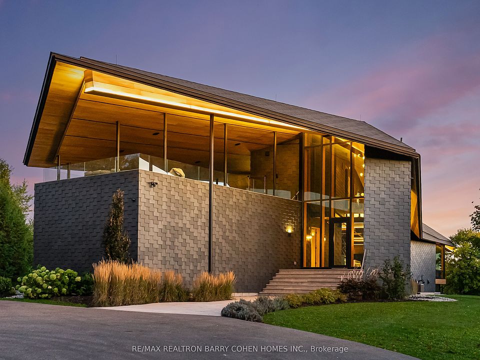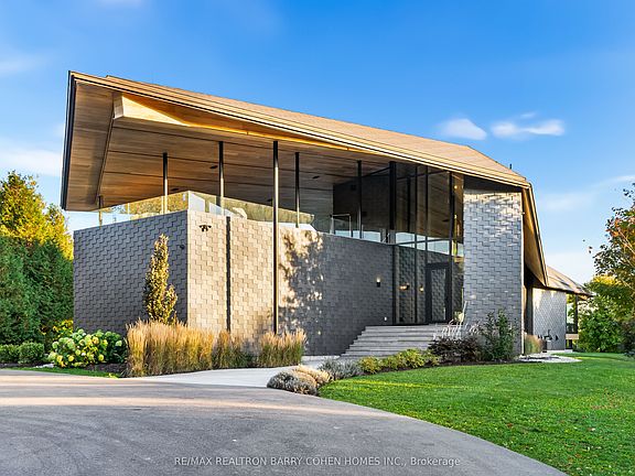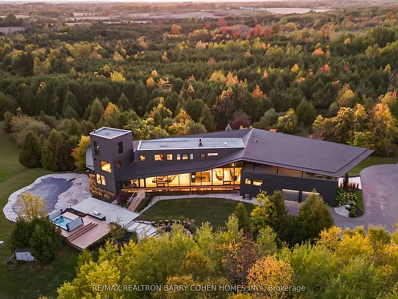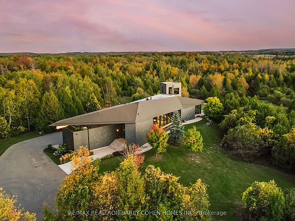 A jaw-dropping architectural statement in the heart of Caledon! This one-of-a-kind residence blends world-class design, natural beauty & uncompromising craftsmanship across 10,300 square feet of living space. Designed by Kariouk Architects w/interiors curated by the renowned Karin Bohn, the home has been celebrated in films, fashion shoots, & multiple design awards, standing as a true icon of modern architecture in Ontario. The exterior showcases a copper roof & natural slate stone siding wrapping both the façade & select interior feature walls-materials chosen for their rarity, permanence, & sculptural quality. Inside, the atmosphere is defined by floor-to-ceiling windows, dramatic lighting & solid white oak tongue-and-groove ceilings. The raised ground-floor design allows for continuous transom windows around the perimeter, filling the lower level w/natural light. A large central floor opening connects the two levels visually & spatially, framing the home's main fireplace & creating a dynamic double-height volume. Throughout the home, you'll find extensive custom millwork, steel beam & suspended walkways, & dramatic vaulted ceilings w/ambitious angles that celebrate the artistry of structure & form. The oak interior doors w/oil-rubbed bronze hardware add a warm, tactile contrast to the sleek architecture. The gourmet kitchen features Gaggenau appliances & is complemented by a secondary prep kitchen/pantry designed for seamless entertaining. Beyond the interior, an impressive covered deck-integrated into the roof system with Ipe floors & B/I speakers, oriented toward stunning elevated views. Outdoor living continues w/a fire pit, hot tub, & inground pool, all set against almost 100 acres of private, forested land-providing tranquility, privacy & notably reduced property taxes. This is not simply a home-it is a work of art, designed for those who value architecture, privacy & the seamless connection between design & nature.