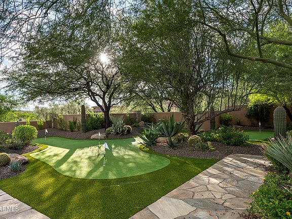 The main residence welcomes you with timeless architectural detail and a seamless connection between indoor and outdoor living. The heart of the home opens to a backyard oasis designed for elevated entertaining, featuring an expansive infinity-edge pool, lush landscaping, a putting green, and a built-in BBQ. Also enjoy the covered patios that perfectly frame the desert and mountain backdrop.