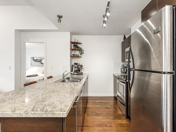 ONLY ONE LIKE IT IN COMPASS APARTMENTS – This unique, custom-designed penthouse condo features an impressive open-concept layout with soaring 12-ft ceilings. The living room, kitchen, and dining area flow seamlessly together, creating the perfect space for entertaining. Generously sized at 980 sq. ft., the unit offers newer paint and stunning engineered hardwood flooring throughout. Bright and beautifully lit with south-facing exposure. Includes a convenient in-unit storage closet. Comes with 2 parking stalls, Pet Friendly, New Dishwasher & Washer/Dryer. Walking distance to new Skytrain Station, Dog Park & All Shopping & Daily Needs. Truly a must-see—come take a look today!