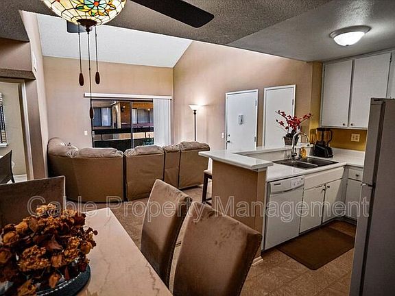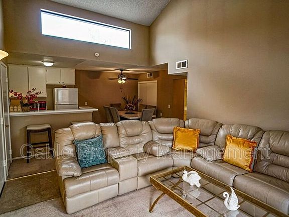 Welcome to this beautifully maintained upper-unit condo in the highly desirable River Canyon community. Featuring 2 spacious bedrooms and 2 full baths, this home offers both comfort and convenience in a serene setting. As you enter, you'll be greeted by a bright and airy living room with soaring high ceilings and an abundance of natural light. A sliding glass door leads to a private patio with extra storage space, ideal for enjoying the outdoors. The cozy, separate dining area is perfect for entertaining, and the open kitchen is equipped with white cabinetry, a breakfast bar, and ample counter space. The hallway bathroom has been recently updated with a new glazed tub/shower, adding a fresh touch to the home. Both bedrooms are generously sized, and the master suite offers a private master bath with a walk-in shower for added comfort. This home is immaculate, with thoughtful touches throughout, including ceiling fans for added comfort and plenty of storage options with closet space throughout. Additional features include 2 covered carports for your convenience. The River Canyon HOA offers fantastic amenities, including a refreshing pool and spa. The location is unbeatable, with easy access to shopping, dining, schools, a movie theater, and scenic walking paths all just moments away. This is the perfect place to call home. Schedule your private showing today! Amenities: community pool