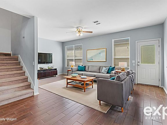 Welcome to 18757 Golden Eagle Way—a move-in ready 3-bedroom, 2.5-bath home offering practical updates, strong value, and an unbeatable location. Perfect for first-time buyers or anyone seeking an affordable entry point into Elgin, this home is just a short walk to the brand-new Elgin High School and has quick access to Hwy 290, shopping, dining, and Austin Community College. The main level features a spacious primary suite with soaring ceilings and ensuite bath. Durable ceramic wood-look tile flooring runs throughout the main living areas, and the kitchen is equipped with stainless steel appliances. Refrigerator, washer, and dryer convey for added convenience. Outside, enjoy a covered front porch shaded by mature trees, plus a detached 2-car garage offering plenty of storage. For peace of mind, the roof was replaced in 2019. With its solid layout, included appliances, and convenient location, this home is priced to appeal to today’s buyers looking for a smart investment in a growing community.