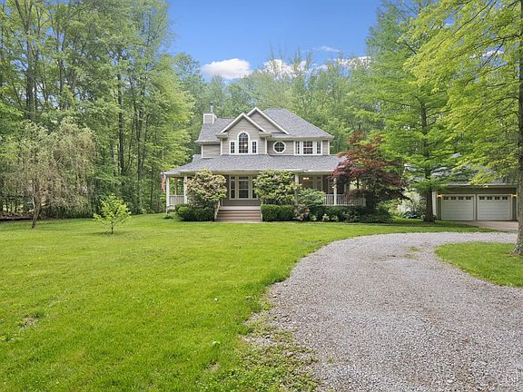 Discover this magnificent, custom-built home nestled on 5 wooded acres just 30 minutes from downtown Cincinnati. Designed to impress, the home features soaring ceilings, expansive windows that fill every room with natural light, and charming wrap-around porches perfect for relaxing any time of day. The main-level primary suite offers comfort and convenience, while the spacious, partially finished basement provides flexible living space and ample storage. The office by the kitchen was a former laundry room with the plumbing/dryer vent still in place. Enjoy the peace of country living with the convenience of nearby amenities just a short drive away. This is 1 of 1!