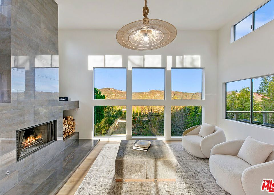 A contemporary zen-like home perfectly situated in the Malibu Bowl neighborhood with panoramic views of the Santa Monica mountains and an attached guest suite! Sold with luxury features including new French White Oak floors, Milgard windows, and an owned solar system. Enter through a gated breezeway into the main floor, marked by beautiful natural light and high ceilings. A comfortable media room flows seamlessly into a living room with a fireplace and out onto a peaceful deck with awe-inspiring views of rugged rock formations set above rolling Pacific clouds that fill the canyon below. A dining area is surrounded by picture windows and connects to a modern kitchen with a large center island, breakfast bar seating, a tiled backsplash, and high-end Miele appliances. Downstairs, a luxurious primary suite offers treetop views with a large walk-in closet and spa-like bathroom complete with stone accents, an open shower, and a soaking tub. There are two additional bedrooms, plus a large attached guest suite with separate access that features a private living/media room, a wet bar with a refrigerator, and a full bedroom with an en-suite bathroom. Outside, a lush and private backyard wraps around the home offering beautiful spaces to entertain or relax and unwind. Features include a built-in BBQ area with additional seating, a gas fire pit, and a lower garden lounge with a newly built enclosed deck. Easily accessed from the primary suite, enjoy a seating area, hot tub, and outdoor shower. Additional features include a 2-car garage plus driveway parking, a Tesla car charger, Amazon Eero Pro 6 mesh high-speed Wi-Fi network, Nest thermostats, Sonos Architectural in-wall speakers, Vivint 6-camera perimeter security system, myQ smart garage opener, Schlage Encode smart locks, and motorized window shades in the living room, media room, kitchen, and primary suite. This central Malibu location is moments from beautiful hiking/riding trails and is less than 10 minutes from Pacific Coast Highway, sandy beaches, and more. With its impressive square footage, this peaceful gem offers the finest of Malibu living!