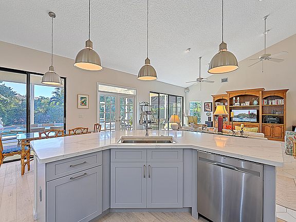 Situated on one of the largest lots in River Ridge, this single-story CBS home is a must-see! The functional, timeless layout boasts high ceilings, an open floor plan, and a spacious covered patio overlooking the sparkling pool--perfect for entertaining or relaxing. The completely renovated kitchen features top-of-the-line appliances, including a Wolf gas range, Monogram double ovens, and a Bosch refrigerator, paired with quartz countertops and a cozy breakfast nook. Additional upgrades include impact windows and two newer AC units (2020/2023). Located in the 24/7 guard-gated community of River Ridge, residents enjoy amenities such as a clubhouse, playground, and tennis/pickleball courts. Lovingly maintained, this home is move-in ready and waiting for you!