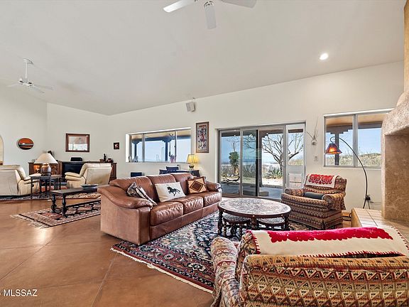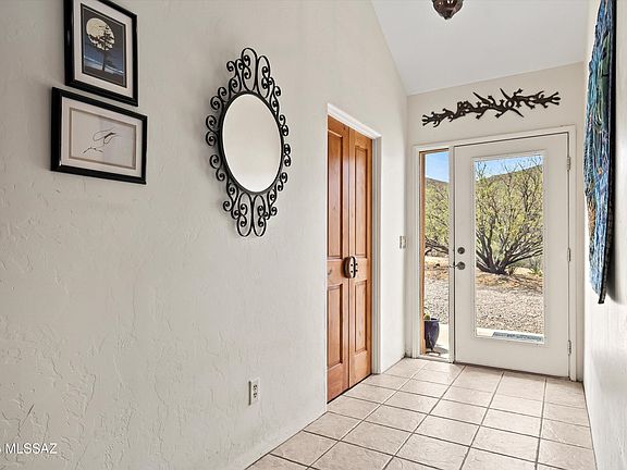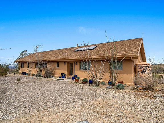 Spectacular views, wide open desert, city, sunrise and sunset views from this home perched at the foot of the Santa Rita mountains. Custom built home with open floor plan, large rooms, custom millwork and built-ins (made with natural pecan, cherry, mahogany, alder, cholla and other woods) make this a truly unique home. A lot of thought went into its orientation and construction. Built for major energy efficiency, metal framed stucco, thick walls created using ''Mikey Block'' (Styrofoam reinforced w/concrete and rebar), solar hot water heater circulates under floors to create an energy efficient space that's easy to heat and cool. The main house is 3 bed/ 2 bath, featuring a large great room, formal dining room, large kitchen and a combined pantry/ laundry room. Covered back patio runs the length of the house, with sunset view. Electronic "fence" with two dog collars for safe roaming. Uses the Sun to heat the house with radiant heat and water from the sky to go to 4 cisterns for watering plants.