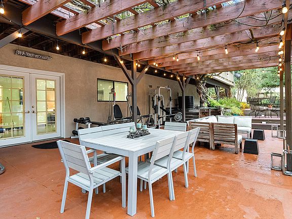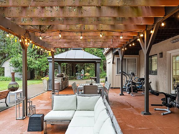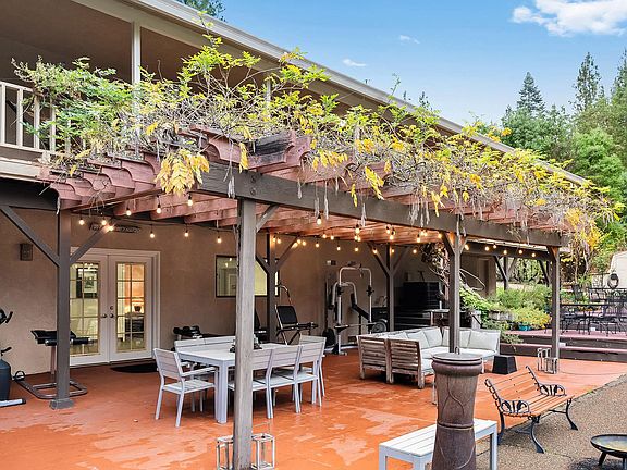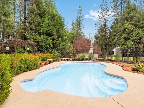 Your Dream Estate in the Hills -A Sanctuary for Living, Hosting & Inspiring. Discover a rare opportunity to own a beautifully maintained and meticulously planned estate—well thought-out—offering endless possibilities for professionals, retreat creators, Airbnb investors, or anyone dreaming of a wellness sanctuary, vineyard, or intimate wedding venue. This stunning 5-bedroom, 3-bath luxury home blends refined comfort with serene natural beauty. From the moment you enter, you'll feel the care and craftsmanship that define every inch of this property. The main floor features rich oak hardwood flooring, abundant dual-pane windows, a cozy wood stove, HVAC, and multiple sets of French doors leading to an expansive covered wraparound deck with its own private spa—ideal for morning meditation or evening relaxation. The chef-inspired kitchen is perfectly designed with granite countertops, elegant backsplash tile, stainless steel appliances, a sous-chef island with seating, and a gas cooktop—all included. A remarkably spacious laundry/utility room offers a second refrigerator, freezer, cabinetry, and an industrial sink, giving you all the workspace you could need for hobbies, retreat hosting, or meal prep. Downstairs you'll find a fully finished bonus living area with a private guest quarters and separate French door entry—perfect for Airbnb income, extended family living, or an on-site wellness instructor. A generous professional office makes working from home feel effortless, and the office furniture stays. Your Outdoor Oasis Awaits as this estate shines as a true entertainer's paradise. Enjoy a fully fenced inground pool, expansive covered patio with bar and built-in outdoor kitchen, three large greenhouse garden spaces, multiple storage sheds, and a dedicated wood storage structure. The grounds are breathtaking—mature fruit trees, manicured landscaping, stone terracing, and lush lawns-this estate offers the space, infrastructure, and serenity to bring your dream to life