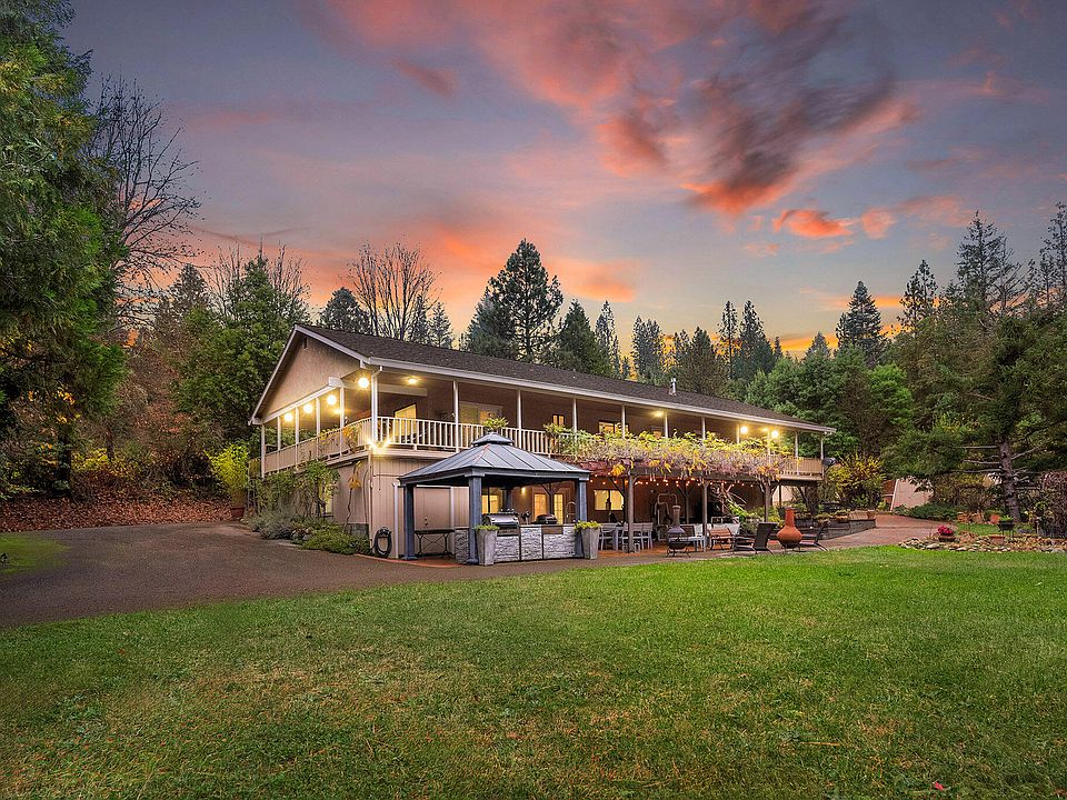 The chef-inspired kitchen is perfectly designed with granite countertops, elegant backsplash tile, stainless steel appliances, a sous-chef island with seating, and a gas cooktop—all included. A remarkably spacious laundry/utility room offers a second refrigerator, freezer, cabinetry, and an industrial sink, giving you all the workspace you could need for hobbies, retreat hosting, or meal prep. Downstairs you'll find a fully finished bonus living area with a private guest quarters and separate French door entry—perfect for Airbnb income, extended family living, or an on-site wellness instructor. A generous professional office makes working from home feel effortless, and the office furniture stays. Your Outdoor Oasis Awaits as this estate shines as a true entertainer's paradise. Enjoy a fully fenced inground pool, expansive covered patio with bar and built-in outdoor kitchen, three large greenhouse garden spaces, multiple storage sheds, and a dedicated wood storage structure. The grounds are breathtaking—mature fruit trees, manicured landscaping, stone terracing, and lush lawns framed by pines, cedars, apple trees, redwoods, and fenced/cross-fenced pastureland. The property includes an attached 2-car garage and a 30' x 40' drive-through metal shop with full electricity—ideal for equipment, hobbies, or future vineyard operations. An automatic whole-house generator, gated entry, circle driveway, high-speed internet, and paved road access all the way to the home makes this rural luxury feel seamless and secure. Located near beautiful Lake Oroville, you're a short drive from world-class boating, fishing, hiking, and outdoor recreation. Whether you envision a peaceful homestead, a wellness or yoga retreat, a boutique Airbnb compound, or a multi-use event property—this estate offers the space, infrastructure, and serenity to bring your dream to life. Find the tranquility and lifestyle you've been searching for. This is it.