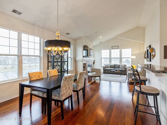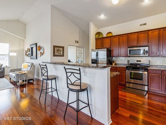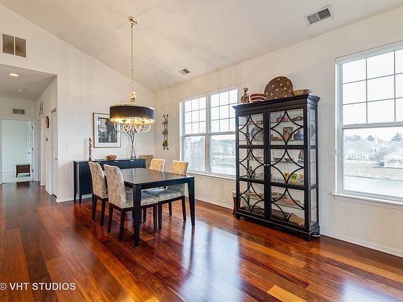 Absolutely Gorgeous! This is the home you have been waiting for. Upper unit ranch with stunning water, wildlife and big sky views for over 180 degrees! Expansive vaulted ceilings and Brazilian hardwood floors throughout the living areas. Large gourmet kitchen has 42" cherry cabinets, stainless steel appliances, and an eat-at island along with a pantry closet. The open concept living is perfect for parties and family gatherings with a generous sized dining area and a cozy family room with wood burning gas start fireplace. The open and bright loft with a south facing window can be used as an office or a reading nook. The master bedroom is oversize with a custom designed walk-in closet. Master bathroom has twin sinks and marble counter tops with tile floors. The second bedroom has a walk-in closet and is located next to a full bath with a tub and ceramic tile flooring. Large laundry room also contains a sink and shelving unit. The custom designed den/office with french doors has a balcony where you can marvel at an exquisite sunrise with a cup of coffee, watch all sorts of bird life from herons and egrets to ducks and hawks, and end your day in awe of the reflected sunsets in this quiet and peaceful setting. Extra storage in 2 car attached garage and another storage unit on site is approx. 9' X 9'. Two miles to I-88 expressway and the Premium Outlet Mall. Also near Route 59 shopping and restaurant corridor as well as Metra train station. A commuter's dream. Located in the immaculately kept Stonegate West community with a luxury clubhouse, pool, and workout room. This is a must see!