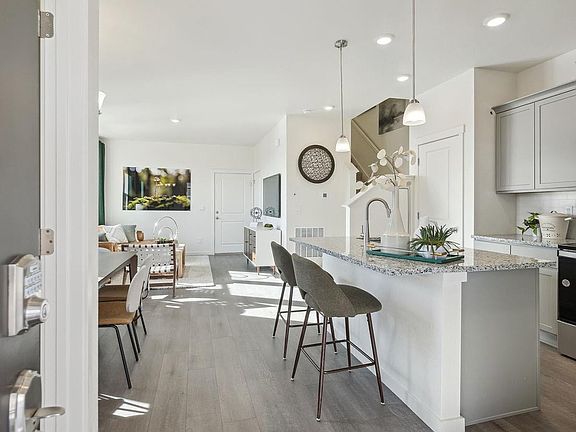 Indulge in the elegance of this low-maintenance home at Settlers Crossing! The Muirfield floor plan, close to area conveniences, offers 3 bedrooms, 2 1/2 bathrooms and a spacious 2nd-level living area. The open-concept kitchen showcases quartz countertops, shaker-style cabinets, large island, and Stainless Steel Whirlpool appliances. The primary bedroom is generously sized and connects to an ensuite bathroom with quartz countertops, and a large walk-in closet. This Smart Home is equipped with keyless entry, a video doorbell, smart thermostat, Wi-Fi garage door opener, Amazon Echo Pop, and a wall-mounted touch screen panel. Enjoy Deako plug-and-play light switches and a tankless water heater. Conveniently located near major highways, this home is less than 15 minutes from Denver International Airport. ***Estimated Delivery Date: February. Photos are representative and not of actual property***