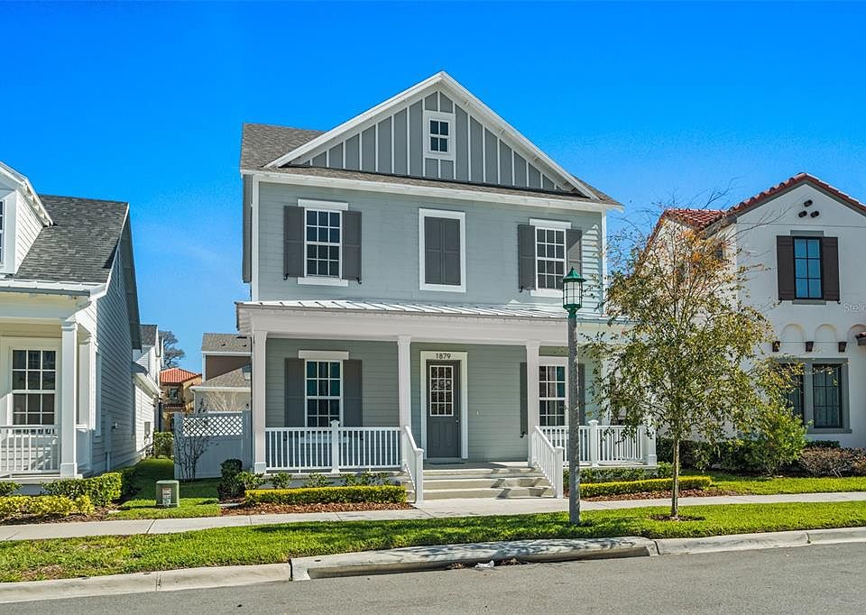 Welcome to this like new Hatteras Coastal in Celebration’s newest neighborhood of Island Village. As you approach the home you are greeted with a quintessential front porch with plenty of room for seating. The spacious floorpan boasts an open concept first floor living area and ceiling height of 9’4” on the first floor and 9’ on the second floor. The kitchen offers a large island with breakfast bar, walk-in pantry, gas cooktop, double ovens and upgraded refrigerator. In addition to the dining room and great room the first floor offers a flex room. Upstairs is two bedrooms located at the front of the home that share a bathroom featuring upgraded shower tile. The owners suite offers a double sink vanity, upgraded tile shower and walk-in closet. The wall mounted television in the owners suite and flex room are included. The pavered covered lanai and backyard are accessed through French doors off of the dining room. The backyard is fully fenced and is the perfect private space to enjoy with family and friends. The attached two car garage has its own air conditioner. The home is conveniently located close to the Island Village amenity center and pool.