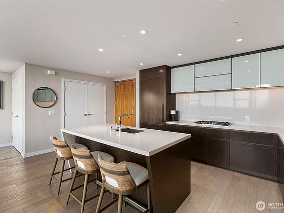 Glimpses of lake washingtonCustom european cabinetryDesigner kitchenWide-plank wood flooringHigh-end gaggenau appliancesCaesarstone quartz countersLarge covered balcony