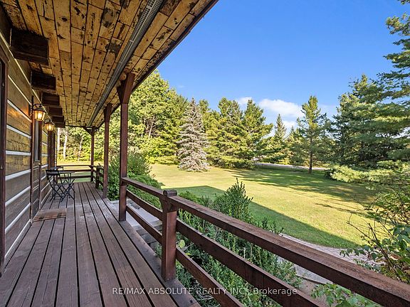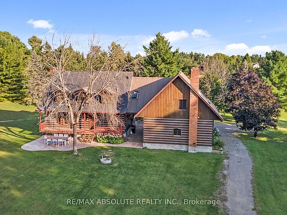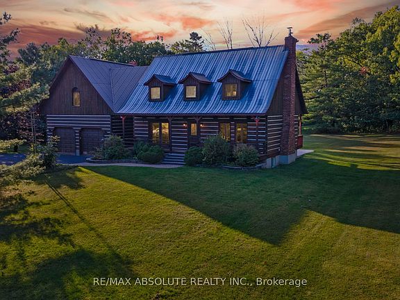 Charming log home on 1.99 acres in Braeside offering 3 bedrooms, 2.5 bathrooms, a versatile bonus room above the garage, a large barn, and a lean-to, with a balance of mature trees and cleared space; enter through a foyer with coat closet leading to a spacious living room with wood-burning stove, newly updated kitchen with ample cabinetry, quartz counters, large island with bar seating for four, pot and pan drawers, undermount sink at window, and adjoining dining room with space for family table and buffet; main floor powder room; upstairs features a primary bedroom with ample closet space and ensuite with vanity, toilet, and tub/shower with ceramic surround plus additional closet space; two secondary bedrooms with ample closets share a full bathroom with tub/shower, ceramic surround and toilet, which also connects to a laundry room with utility sink and storage; the bonus room above the garage provides flexibility for a family room, home office, hobby space or extra bedroom with inside access to the garage; finished basement includes a large family room with wood stove, bar area, and storage/utility room; wood heat throughout creates a cozy ambiance; outside enjoy the barn, lean-to, and generous acreage offering privacy and endless possibilities. 24hrs irrevocable on all offers.