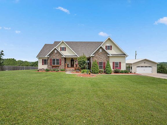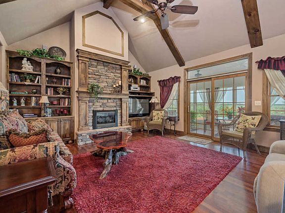 Enjoy the incredible view while sipping a glass of sweet tea in the sunroom of this custom built four bedroom two bath home on three acres just 15-20 minutes from downtown Branson. This gorgeous home features wood beams, rock fireplace, alder wood cabinets, formal dining room, crown molding, reverse osmosis, vaulted ceilings, and rec room. The detailed touches to this home are numerous. If that's not enough, in addition to your two car attached garage, you will find a detached two car garage/workshop. Who says you can't have it all? A great place to relax in the country...but...also close to town. Time to make this your forever dream home.
