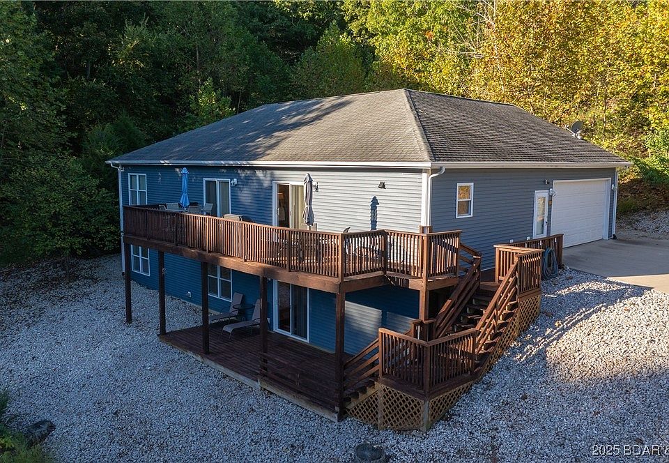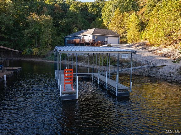 Escape to lakefront living at its finest with this stunning 5-bedroom, 3.5-bath home on the beautiful Lake of the Ozarks. Nestled on a gentle lot with 229 feet of shoreline, this property offers rare privacy and tranquility with views stretching out to the main channel. Enjoy calm waters perfect for swimming from your private dock featuring a 12x32 slip. Inside, the spacious floor plan offers 10’ ceilings, two full kitchens, two living areas, and two ensuite bedrooms—ideal for entertaining or large families. A 2-car garage and plenty of parking make this home the ideal lake package! Situated right off the Bagnell Dam strip by land and at the 1MM by water, this property blends its tranquility with convenience to the fun Lake of the Ozarks is famous for! Whether relaxing on the deck, taking in the beautiful lake views, or hosting friends by the water, this lakefront retreat perfectly blends comfort, function, and peaceful lakeside charm. Schedule your showing today!
