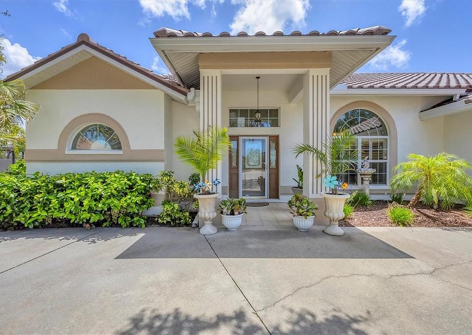 As you step inside this beautifully maintained home in the gated community of Hidden Lakes, your eyes are immediately drawn through the spacious living area to the oversized sliding glass doors that frame the view of your private backyard oasis—complete with a sparkling pool, lush tropical landscaping, and an expansive lanai perfect for indoor-outdoor living. Set on an impressive 0.46-acre cul-de-sac lot, this property offers rare privacy and room to roam in one of Venice’s most desirable neighborhoods. With 2,252 square feet under air, this home features soaring volume ceilings, two skylights, and a bright, open floor plan that creates a welcoming and airy feel throughout. The split-bedroom layout includes three oversized bedrooms, each with walk-in closets, and a primary suite featuring dual walk-ins, double vanities, a jetted soaking tub, and a separate walk-in shower. The second bathroom also serves as a convenient pool bath. A brand-new roof, new pool heater, and well-maintained systems add peace of mind, while the oversized two-car garage and separate laundry room with built-in office space provide excellent storage and functionality. This home is located outside of a flood zone, with low HOA fees and no CDD, offering comfort, space, and value in a serene, established community just minutes from beaches, downtown Venice, shopping, dining, and top-rated golf. Don’t miss the chance to make this rare Florida retreat your own.