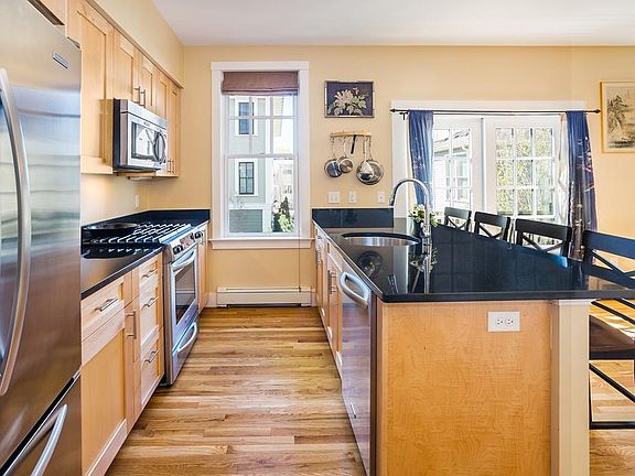 Conveniently located between Central and Inman Squares, this 2BR, 2 BA Aposhian townhouse was built in 2010. 1012 sq ft 3 levels + 200 sq ft finished basement. The home is set back from Prospect St in a quiet courtyard. First floor bedroom/study with bathroom en suite. Second floor open concept kitchen and living room with built in island, maple cabinets, and modern appliances (inc. stacked washer and dryer). Third floor spacious master suite with lofted ceilings, en suite bath and walk-in closet. Oak floors and high ceilings throughout. Wall-mounted A/C, dedicated parking spot, professionally managed HOA ($385/Month). Walking distance to Harvard, Kendall squares and Red Line T.