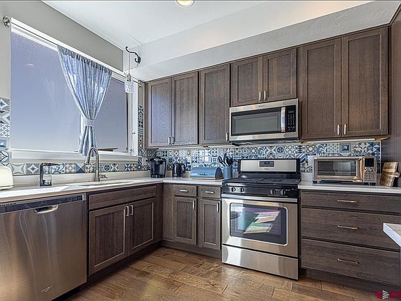 Check out this impeccably kept, 1464 square foot 2 bedroom 2.5 bath End-unit, townhome in Three Springs!! It has a warm cosmopolitan feel with wood floors and an open floor plan on this level, which is only 5 steps up from the sidewalk! ~~~ This area features a large kitchen with eat-at island, room for a dining table and a spacious living room. There is also a powder room for convenience and a balcony deck off the well-appointed kitchen. The two bedrooms are on the 2nd floor, each with an ensuite bath and walk-in closet. The laundry room, with included washer and dryer, is also on this level, along with the utility closet with the forced air heat unit and a 50 Gal water heater. (The air conditioning condenser is on the roof). The large tandem garage is on the lower level, with access from the back of the townhome below, providing room for two vehicles or plenty of work/toy/storage space. Pets allowed with restrictions, see covenants. This townhome is on the corner, very light and spacious with contemporary flair and neat architectural features. ~~~ These townhomes have their own HOA with a monthly fee of $155. The average utilities are very reasonable, approximately $315 a month with Spectrum internet (not TV/cable). Three Springs also has its own associations, the Master and Residential Association, their fees are $112.25 quarterly. See associated Docs and Three Springs website. ~~~ Three Springs is annexed into the City of Durango with central water and sewer, easy access, and a multitude of City amenities and conveniences with bus service into town, trails, parks and open space.